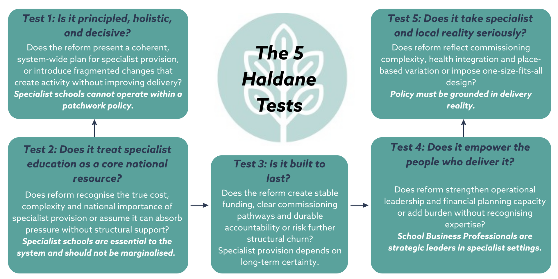 Applying the Haldane Tests ensure that reform is judged not only on ambition, but on deliverability for specialist settings. Children and young people with the most complex needs depend on sustainable, coherent and durable infrastructure. Schools Business Professionals are central to that infrastructure. NNoSS will ensure reform is tested accordingly.